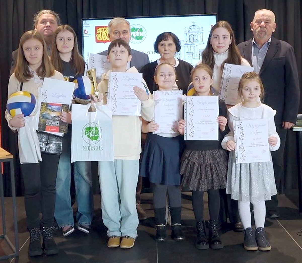 Laureaci konkursów plastycznych w towarzystwie Krzysztofa Wiatra – prezesa PTTK Oddział Końskie, Jacka Szmita – dyrektora SP nr 2, Janiny Ceterowskiej – nauczycielki i opiekunki MKF w SP nr 2 oraz Włodzimierza Seligi – prezesa Okręgu Świętokrzyskiego PZF.