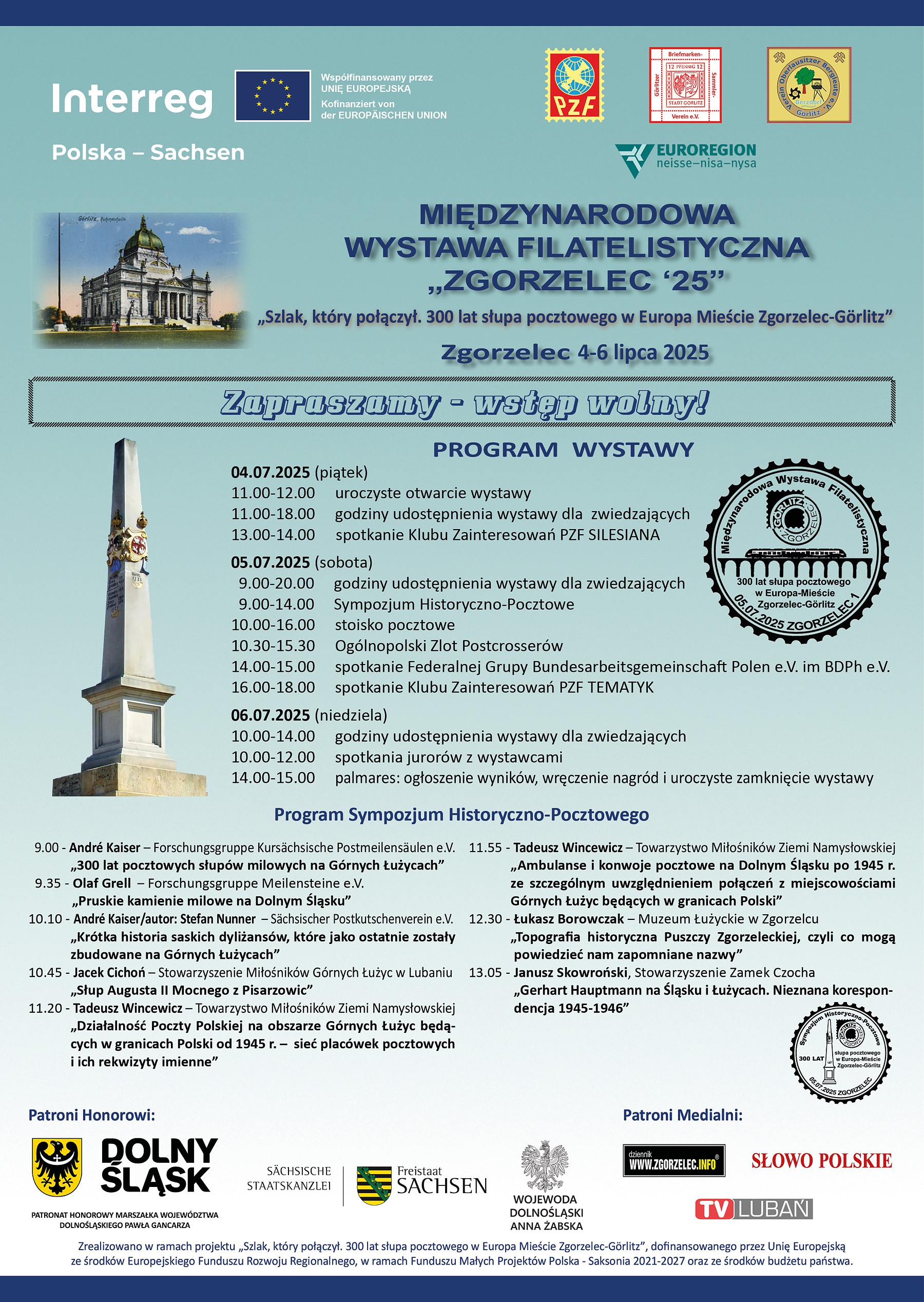 Na Międzynarodowej Wystawie Filatelistycznej „Zgorzelec '25" (od piątku 4 lipca do niedzieli 6 lipca — Miejskim Domu Kultury w Zgorzelcu, ul. Parkowa 1) pokazane zostaną łącznie 104 eksponaty z Polski, Niemiec, Czech, Szwajcarii, Ukrainy, Albanii i Finlandii (34% stanowią eksponaty spoza Polski, aż 16% eksponatów to debiuty na wystawie II stopnia).