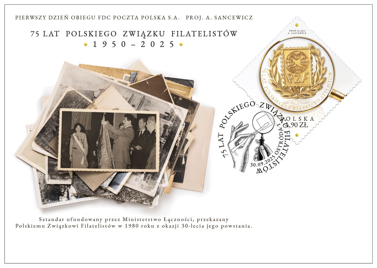 Prezentujemy walory wydane przez Pocztę Polską S.A. z okazji 75-lecia Polskiego Związku Filatelistów. Na znaczku przedstawiono odznakę Członka Honorowego PZF, a na kopercie FDC archiwalną fotografię prezentującą sztandar, ufundowany dla PZF przez Ministerstwo Łączności w 1980 roku.
